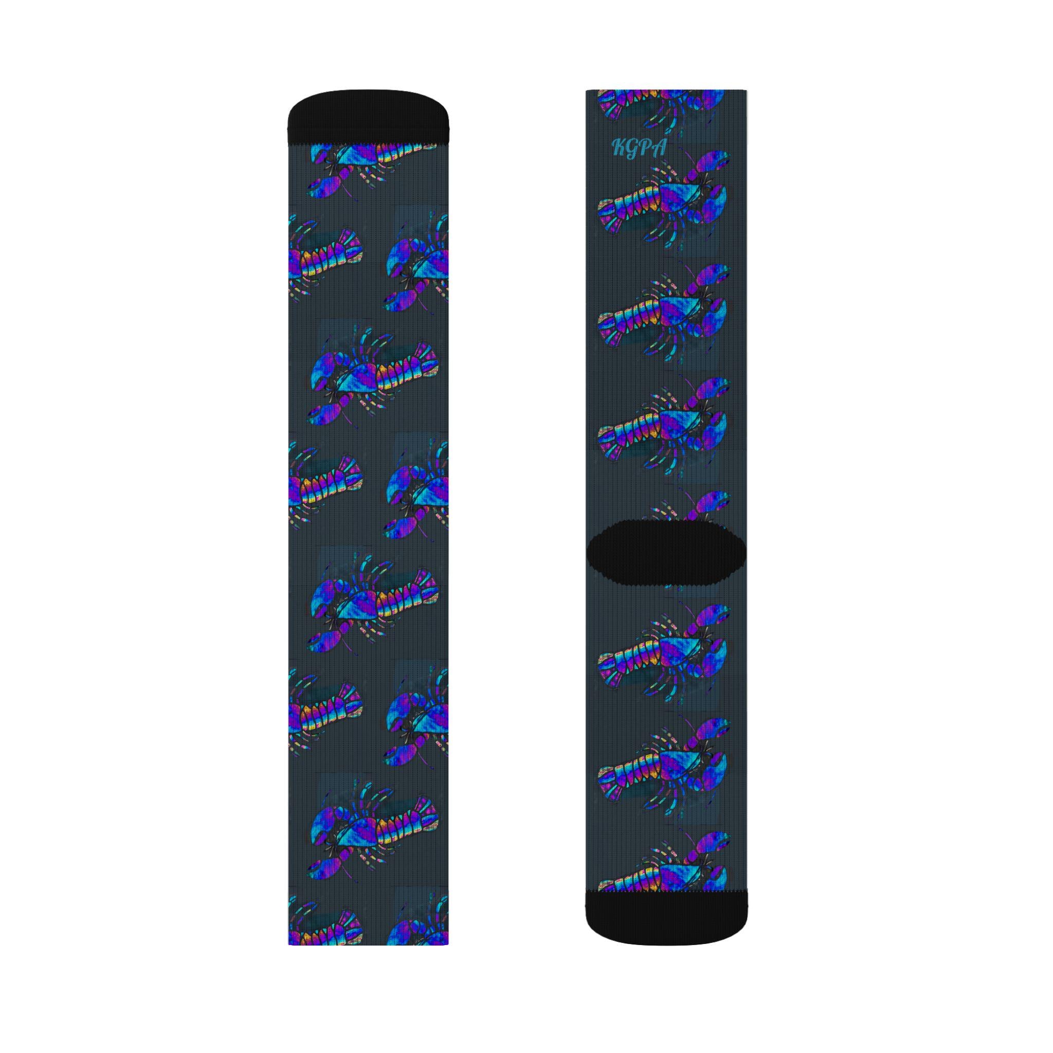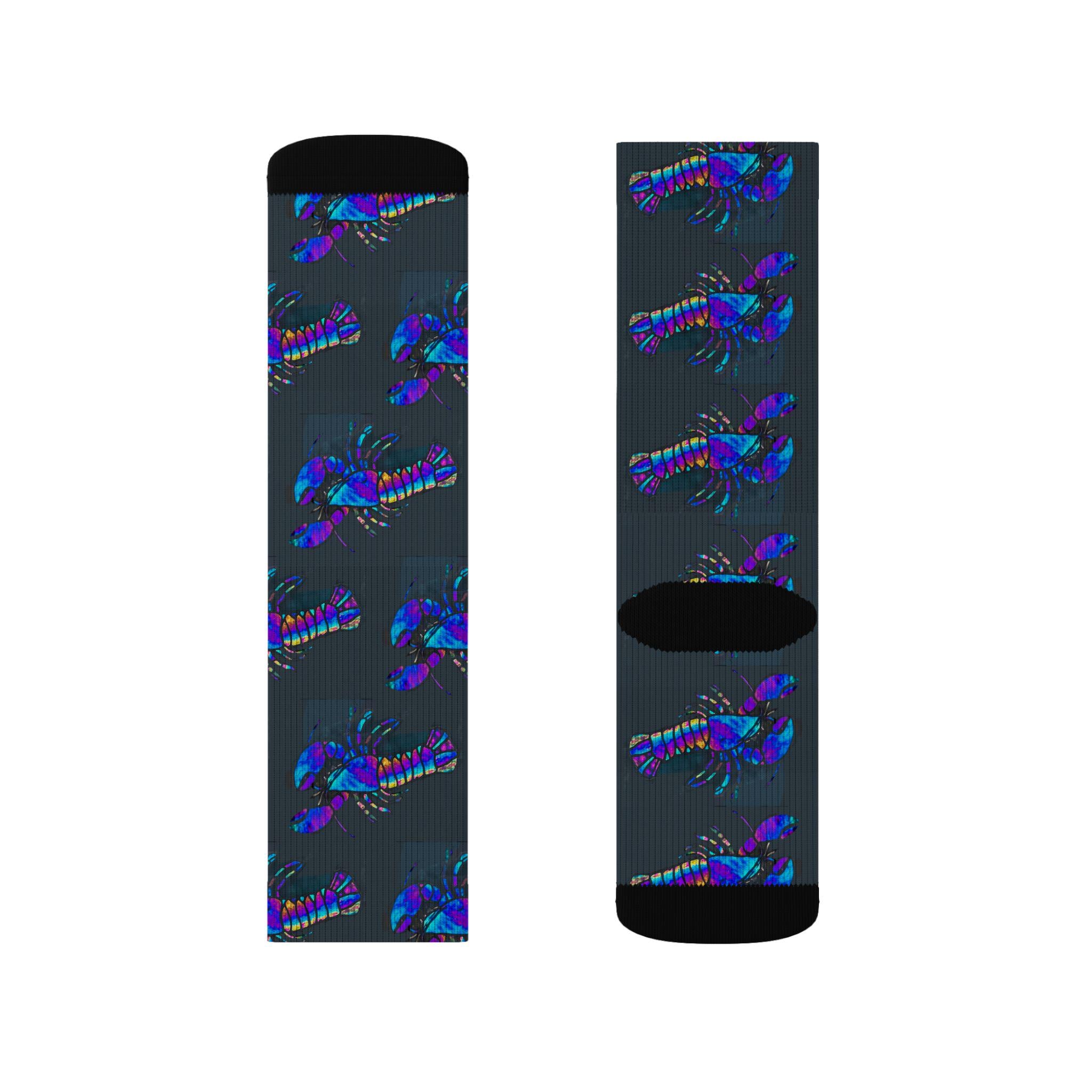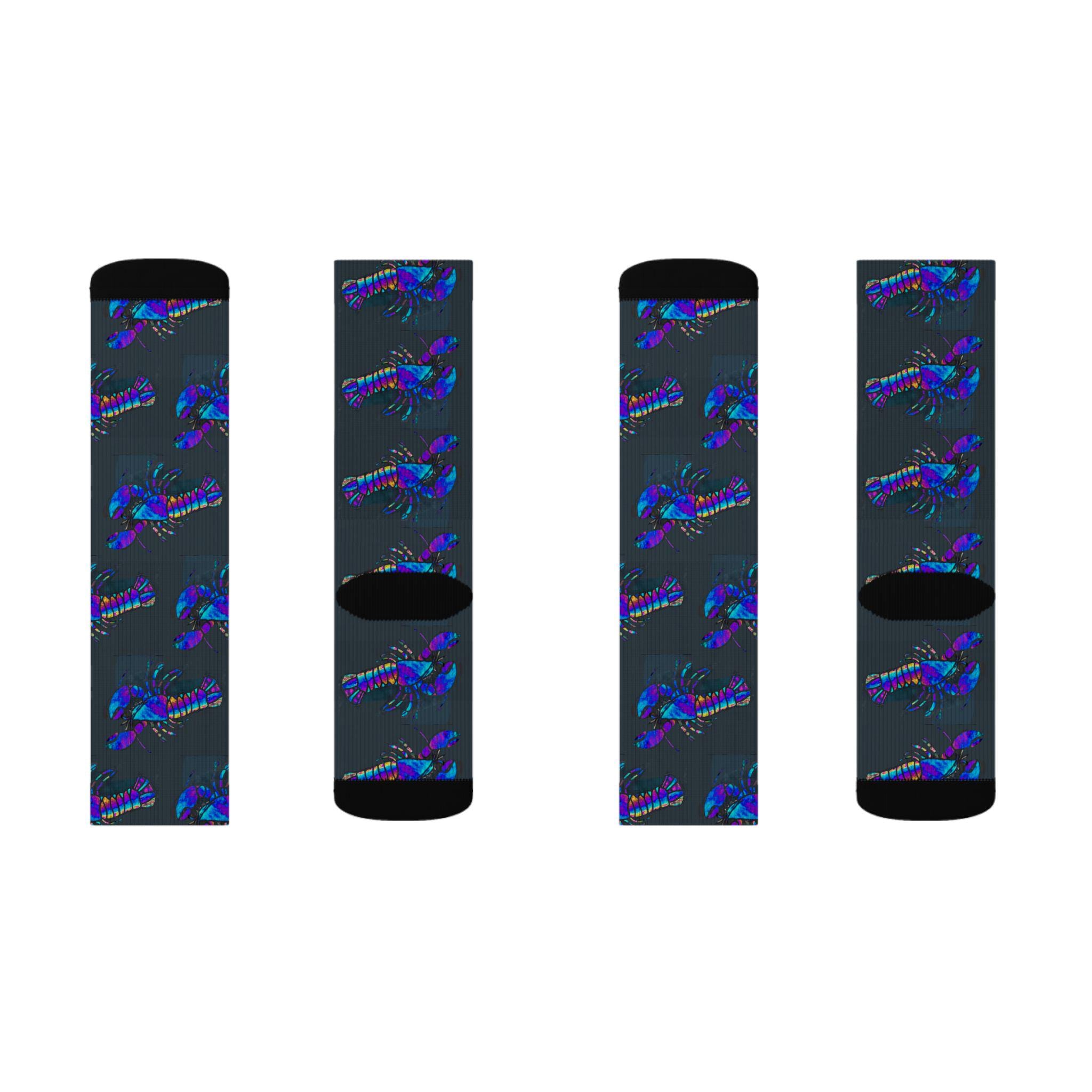 These crew-length socks bring a touch of ocean-side whimsy to everyday wear. The blue lobster pattern wraps completely around the sock, bright and bold on a soft, fleece-lined interior that keeps feet warm on chilly mornings. They sit mid-calf with a ribbed tube that stays in place through long days, and cushioned bottoms add comfort whether you’re standing, walking, or lounging. Lightweight stretch from polyester and spandex keeps the print crisp while the three size options make them easy to share among friends or family. Note: the flat sublimation print may show slight color variation at side seams.